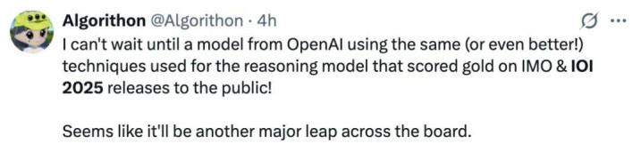 也许正如下面这位网友所言,大家现在迫不及待想看到 OpenAI 推出采用在 IMO 和 IOI 2025 夺金推理模型的相同(或更强)技术的公开版本!看起来将会是又一次全方位的重大飞跃。