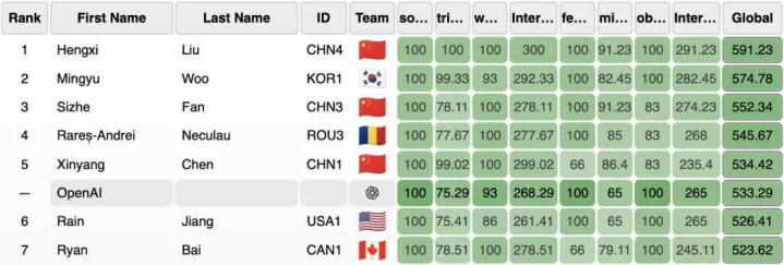 在比赛中,OpenAI 参加了 IOI 的在线 AI 赛道,在 330 位人类参赛者中,所用推理模型的得分只落后于 5 位人类选手,拿下了 AI 参赛者中的 No 1。