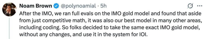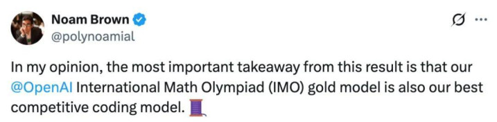 OpenAI 专注于多步推理、自博弈和多智能体 AI 的研究科学家 Noam Brown 表示,「重要的启示是:我们在 IMO 上取得金牌的模型就是最好的竞赛编程模型。」
