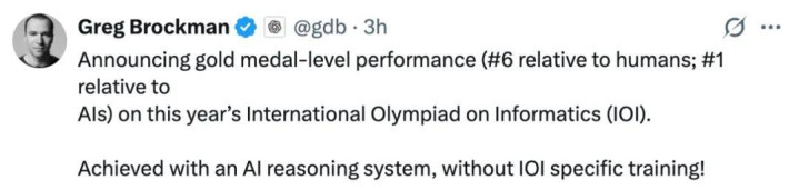 OpenAI 联合创始人、总裁 Greg Brockma 盛赞了此次 IOI 中自家模型「金牌级的表现」。