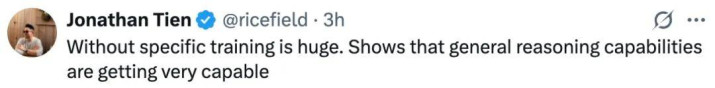 对于此次 OpenAI 在 IOI 赛事中取得金牌,网友感叹到:没有专门训练就取得了这样的成绩,很了不起,这意味着通用推理能力正变得非常强大。